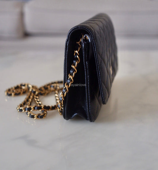 CHANEL Black Caviar Microchipped Classic Wallet On Chain Gold Hardware