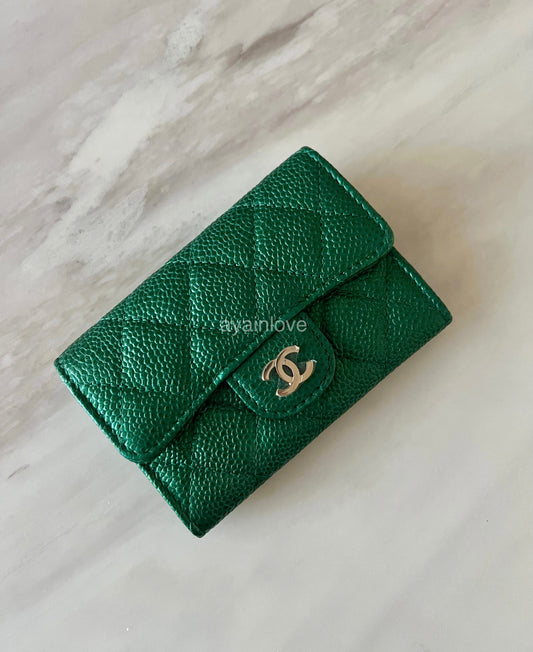 CHANEL 18S Iridescent Green Caviar Small Snap Card Holder Light Gold Hardware