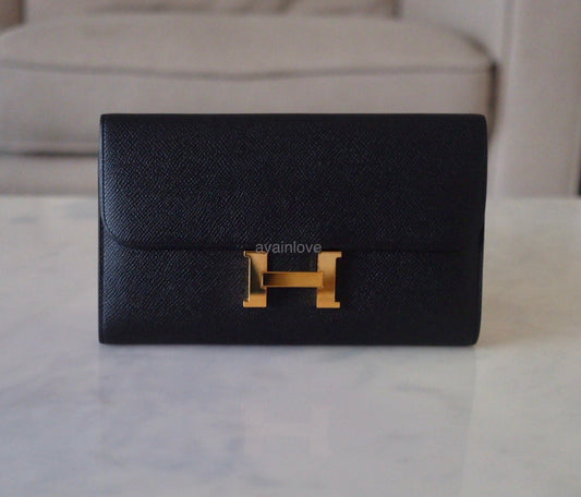 HERMES Constance Noir Black Epsom Long Flap Wallet Gold Hardware