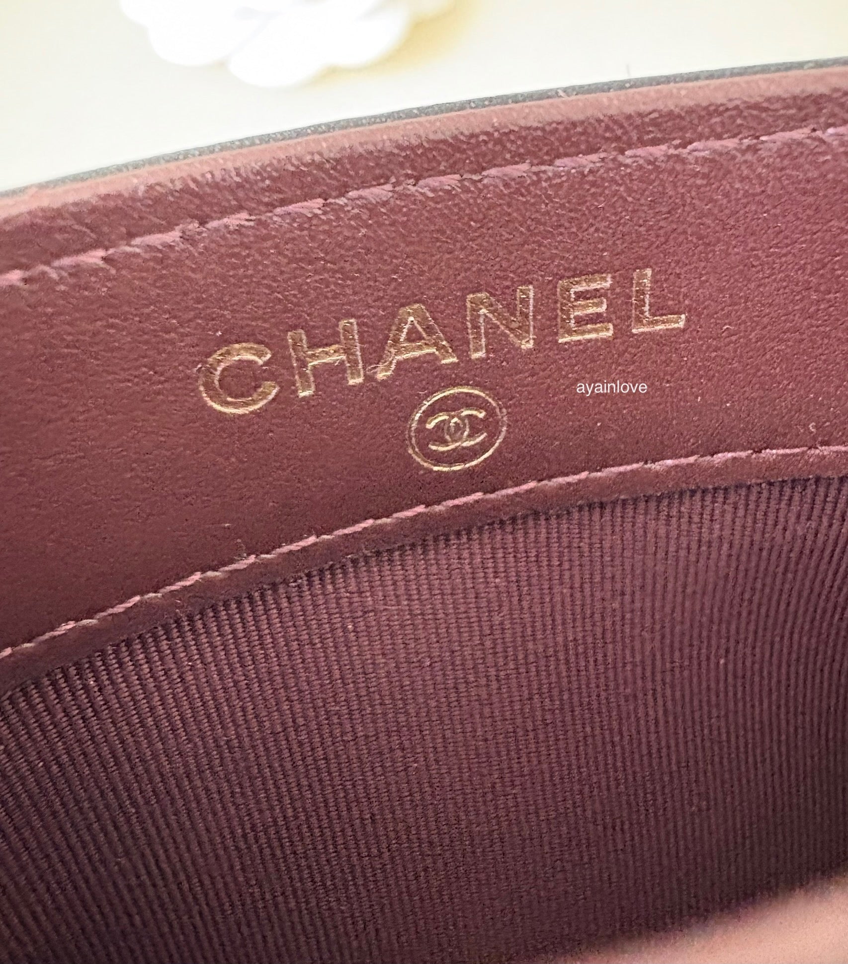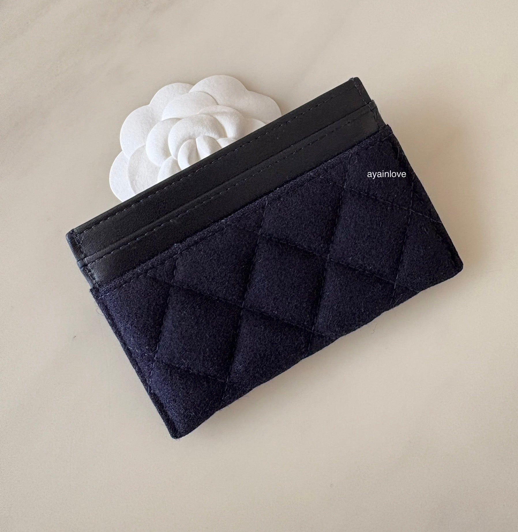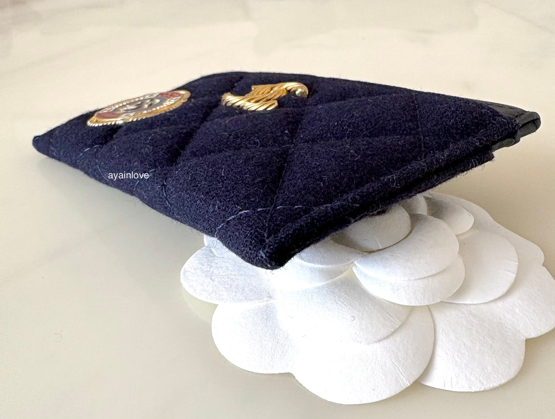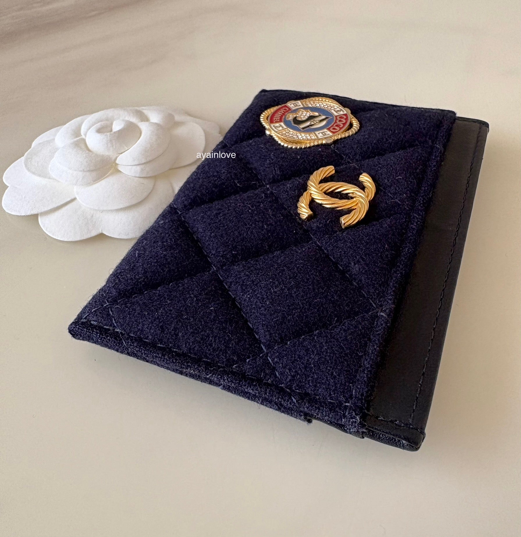 CHANEL 18A Charming Navy Blue/Burgundy Wool/Calfskin Flat Card Holder Oversized CC Gold Hardware