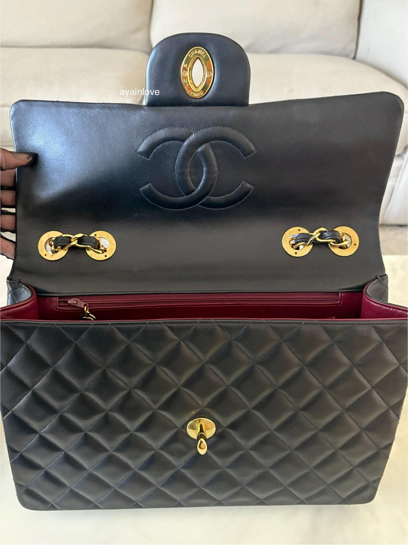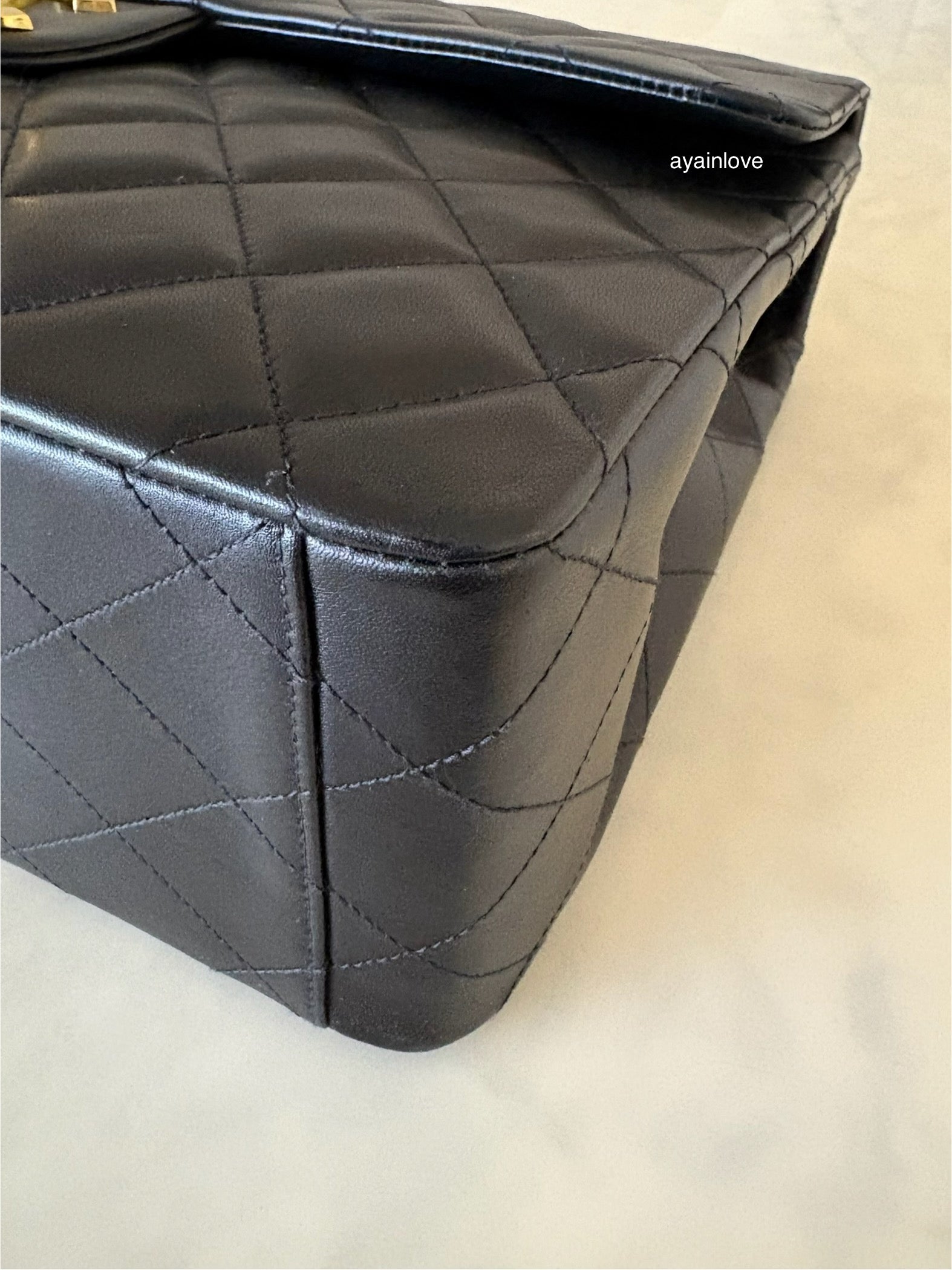 Stunning single flap XL Jumbo classic in butter-soft black leather quiltings, oversized CC lock and 24KT gold plated hardware. This single flap classic has been discontinued for many years and in rare pristine condition for her age. Collector’s delight.