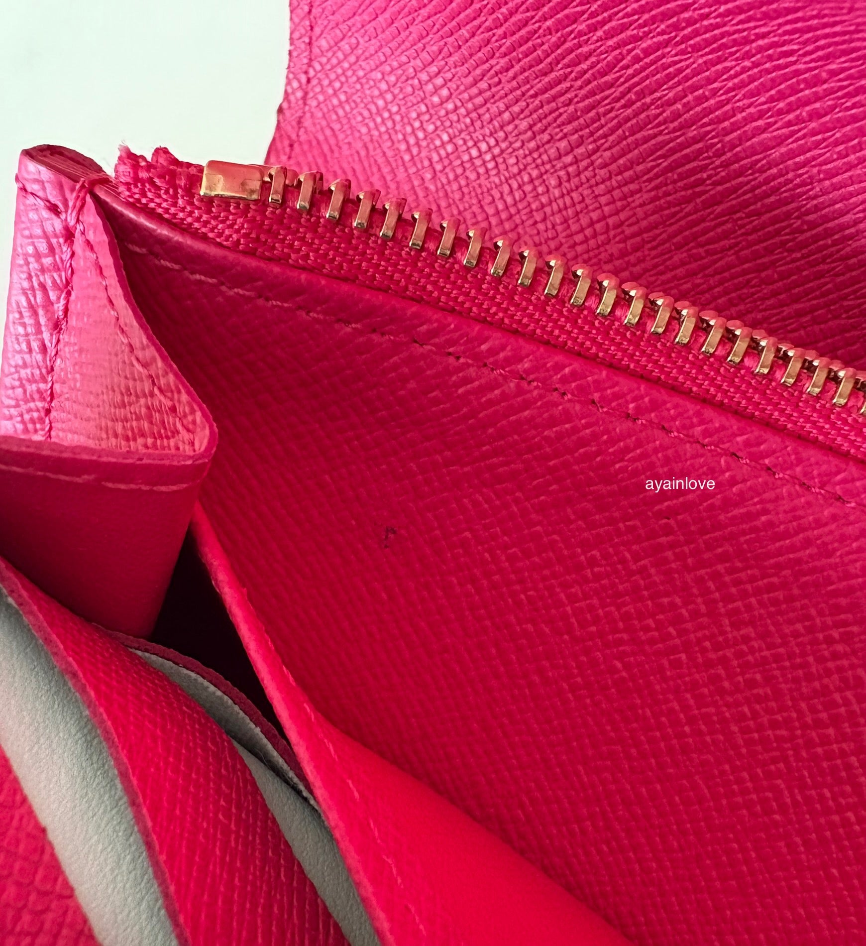 Pristine exterior, no scuffs. Slight stretch on pockets. Clean pink interior with tiny stain on one pocket (hardly noticeable), otherwise as new. Faint hairlines on the button closure.