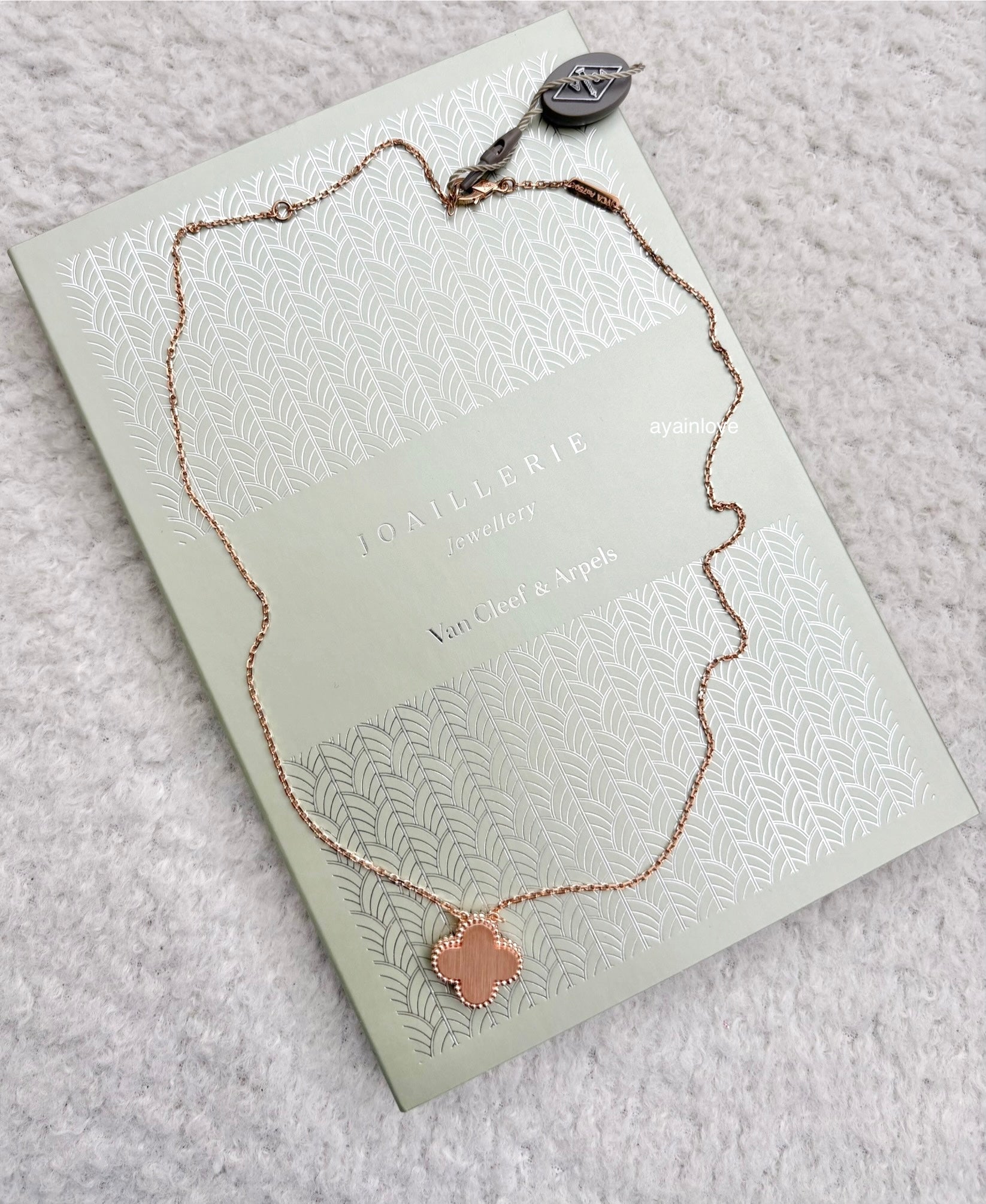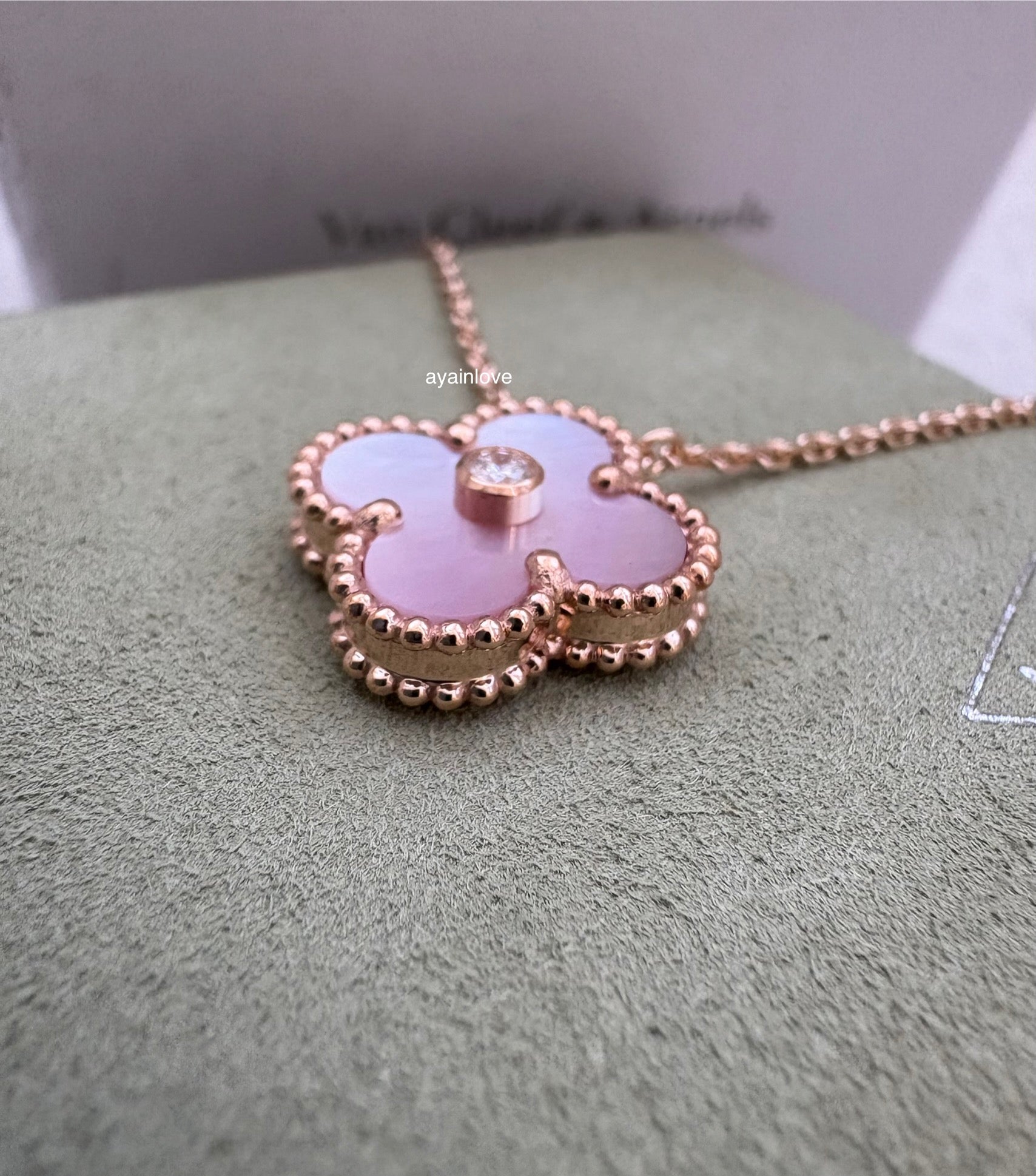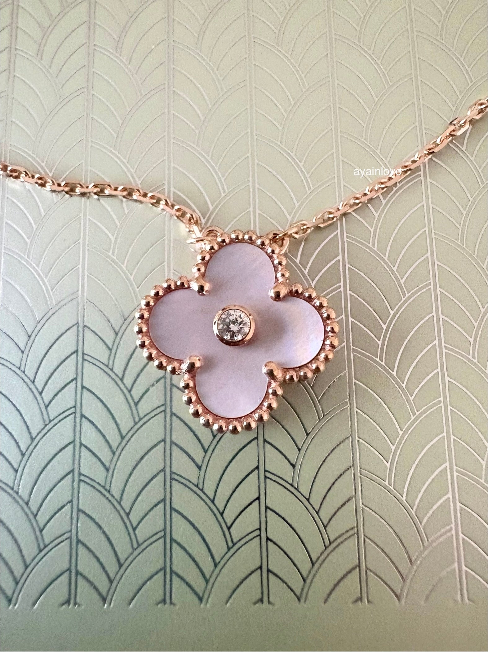 Limited edition 2025 holiday pendant necklace in Pink Mother of Pearl. Elegantly set in a special order VCA gem, Pink Mother of Pearl, and 18K Rose Gold with solid diamond centre.
